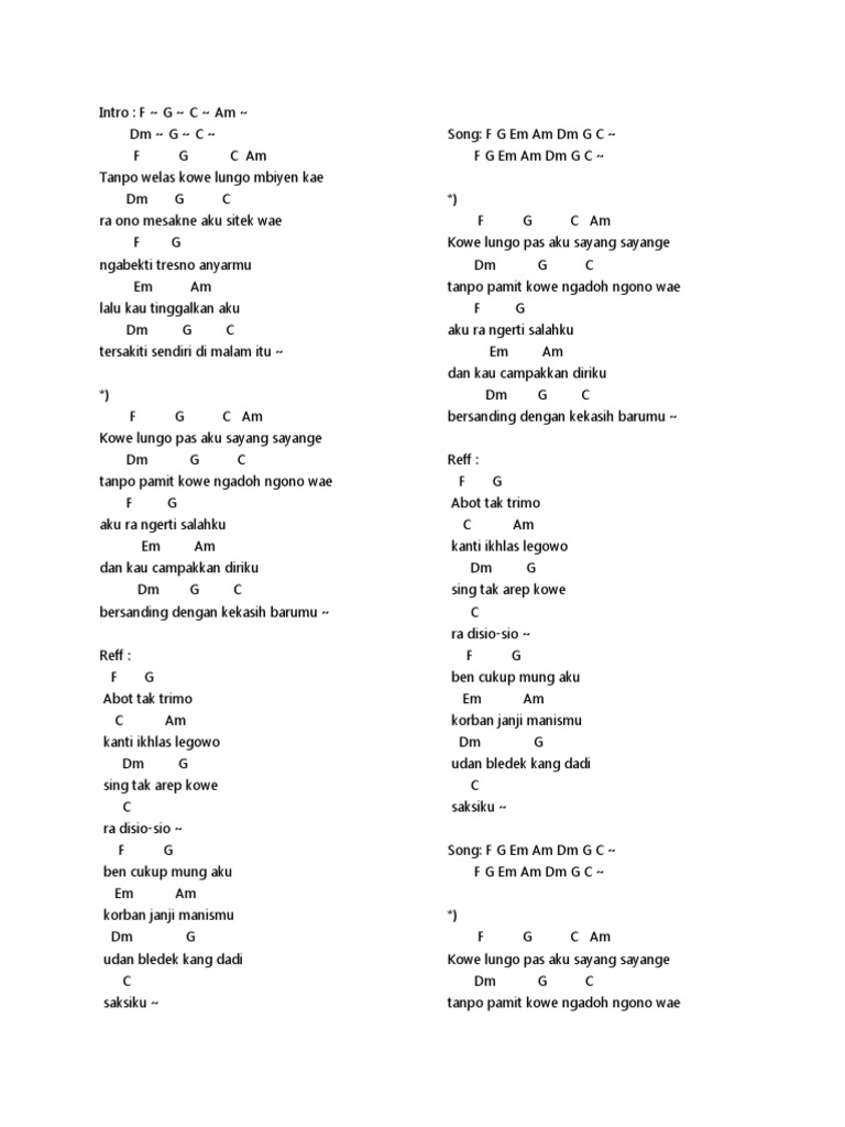 F G C Am Kowe lungo pas aku sayang sayange Dm G C tanpo pamit kowe ngadoh ngono wae F G aku ra ngerti salahku Em Am dan kau campakkan diriku Dm G C bersanding dengan kekasih barumu.